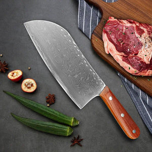 Handcrafted with precision ,ultra-sharp meat and vegetable cleaver effortlessly slices through any task in the kitchen. Featuring a durable wood handle and forged multiple Damascus steel blade, it delivers exceptional performance and longevity. Perfectly balanced for ultimate control, this knife is a must-have for any kitchen. Keep it sharp, keep it sleek.