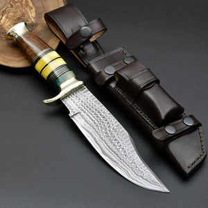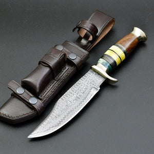 Elevate your collection with this Handmade Custom 1095 Damascus Bowie Knife, a stunning blend of artistry and precision engineering. This knife features a carefully crafted Damascus blade, an exotic handle, and a bespoke sheath, offering both functional excellence and elegant design.