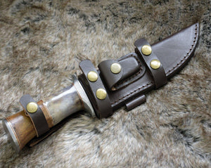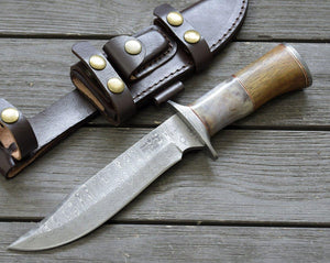 Make your outdoor experiences prefect with our 12-inch Damascus Steel Knife, featuring a precision Trailing Point Blade. Expertly crafted, this knife showcases a striking Camel Bone and Rosewood handle, blending artistry with exceptional functionality.