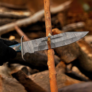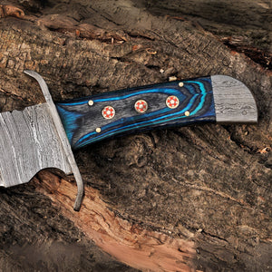 The blade is forged with care, reaching a hardness of 57-59 HRC—making it tough enough for serious work while holding a razor-sharp edge. The 5-inch handle, made from smooth stained wood, offers a comfortable, sturdy grip, while the Damascus steel bolster adds both style and strength.
