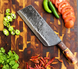 Heavy duty robust chopper/cleaver boasts an 8" blade crafted from 1084 carbon steel. The 5" full tang handle is equipped with walnut scales secured by copper pins. Perfect for chopping through cabbage or slicing tenderloin, its straight design makes it a joy to handle and effortlessly cuts through bone with option of engraving on blade or leather cover make ideal gift for anyone.