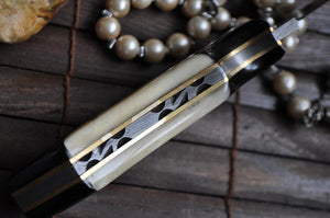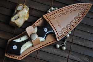 Featuring a 4-inch Damascus steel blade and a 4-inch handle crafted from natural bone, buffalo horn, and mosaic pins, this dagger blends elegance with durability. Complete with a handmade leather sheath, it's a perfect balance of artistry and functionality