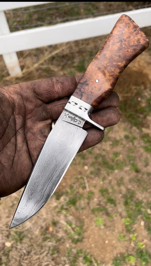 Crafted for the outdoorsman, this Bowie knife features a hand-forged Damascus steel blade with exceptional edge retention and striking patterning. The handle is made from premium walnut wood, offering a comfortable and secure grip in any condition. Perfect for hunting, camping, or display, this knife can be personalized with an engraved name, making it a one-of-a-kind tool or gift.