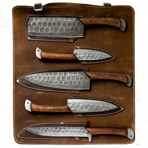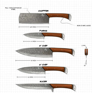 Elevate your kitchen with Jun Arc wood Damascus Steel Chef Knife Set. Crafted from 300-layer Damascus steel, these knives offer exceptional sharpness, strength, and durability. The full tang design and triple-riveted Bois d'Arc wood handles provide perfect balance and control. Each blade features stunning, one-of-a-kind swirling patterns.