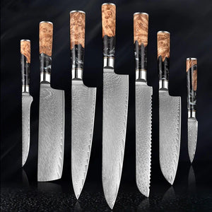 Epoxy Handle Damascus Sharp Knife Set of 7 ideal for all the cutting tasks in the kitchen. The combination of unique epoxy oak wood handles make this knife set a different from knives is made with 67 layers of original Japanese VG-10 Damascus steel. hardened to 61 HRC Rockwell make this knife set very durable and elegant at the same time further you can engrave the initials for gifting someone on special occasions.