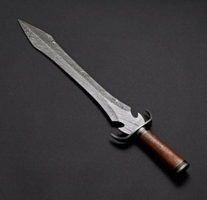 This Damascus Steel Double Edge Sword features a finely crafted walnut wood handle and a robust Damascus steel blade. The sword comes with a durable leather case and offers customization options to personalize your piece one of ideal gift for Damascus steel sword lover it can be engraved and customize as well.