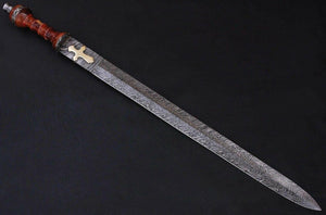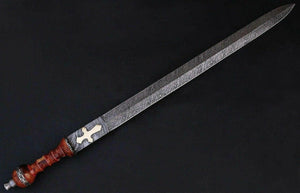 Discover the artistry of our custom handmade Damascus steel sword. this sword offers a commanding presence. The blade, crafted from 352 layers of Damascus steel and forged from 4340 and 1050 high carbon steels, features a hardness ranging from 55 to 60 HRC, ensuring exceptional sharpness and durability. The handle, made of elegant rosewood with Damascus steel spacers and pommel, provides both beauty and balance. Perfect for collectors and enthusiasts, this sword combines stunning craftsmanship with superior performance.