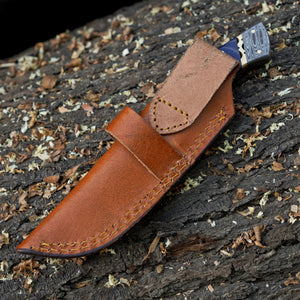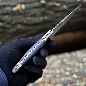 Cut through the wild with confidence. The frostbiteis a compact 8" hunting knife forged from ladder-pattern Damascus steel, built for precision and power in the field. Its 3.75" razor-sharp blade pairs with a rugged full-tang frame and a stunning Micarta handle, featuring Damascus bolsters, mosaic pins, and brass spacers.