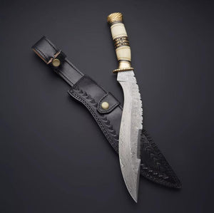 Bone Claw Damascus Kukri is a handcrafted masterpiece designed for hunters, outdoorsmen, and collectors. With a total length of 15 inches, this kukri balances strength, style, and precision. The 9.75-inch Damascus steel blade is razor-sharp, heat-treated to 55–58 HRC, and built to deliver powerful cutting and chopping performance.