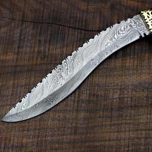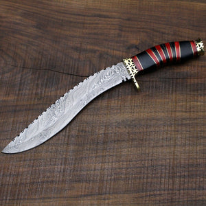 The handle is a work of art, combining Black Micarta with Red Wine Densified Wood, accented by solid brass guard, rings, and butt cap for durability and striking aesthetics. Despite its intricate craftsmanship, this knife is built for heavy-duty performance — whether in hunting, survival situations, or even your ultimate zombie apocalypse gear setup.