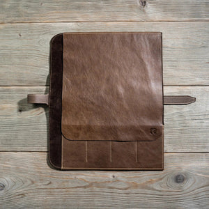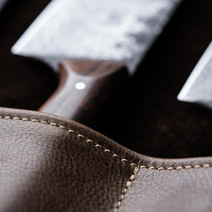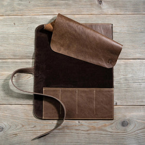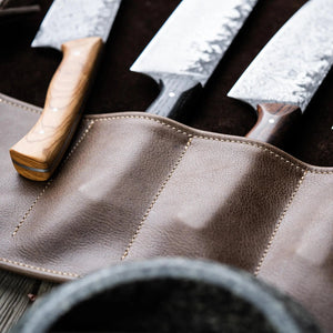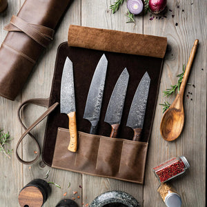 This classic leather knife roll ensures your knives stay securely in place, even during active transport. Featuring 4 double-stitched slots and a sturdy suede inlay, it offers reliable protection and stability for your knives. with option of custom name engraving on it make it prefect one to gift.