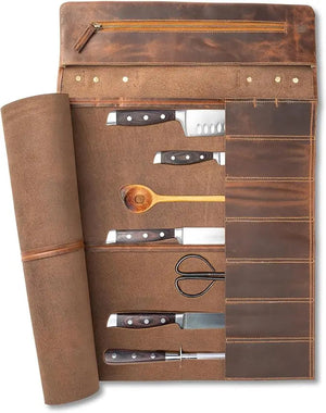 The chef knife roll bag is a premium, 60 x 40 cm leather roll with seven 5 cm compartments, securely closed by a leather flap and two straps. Made from durable cow leather and high-quality canvas, it includes a zippered pocket for accessories like whetstones and scissors. with option of customization and engraving your restaurant or your own logo or name on it make it ideal for branding and gift Its cut-resistant, lockable design ensures safe transport, and it features a classic vintage style with unique natural leather patterns. Optional shoulder strap adds convenience. Angus Stoke prioritizes quality and customer satisfaction, offering elegant, functional knife storage for chefs.
