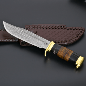 Darkstar Vanguard Damascus Bowie Knife , featuring a robust clip point blade crafted from 1095 Damascus steel. With its striking bull horn and stacked leather composite handle, this knife combines durability and style. The hand-stitched leather sheath ensures secure carrying, while professional sharpening and optional personalization make it a standout choice for both collectors and outdoor enthusiasts.