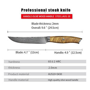 Olive Wood Damascus Steak Knife Set enhance your steak experience with Jun premium collection of steal knife set made with high standard AUS10 Damascus Steel Steak Knife Set, meticulously crafted for the discerning connoisseur. the handles are made with olive wood make this knife set a beautiful piece of craftsmanship, Each steal knife is forged from AUS10 Damascus steel, renowned for its exceptional hardness (58-60 HRC), make it vey durable and long lasting.